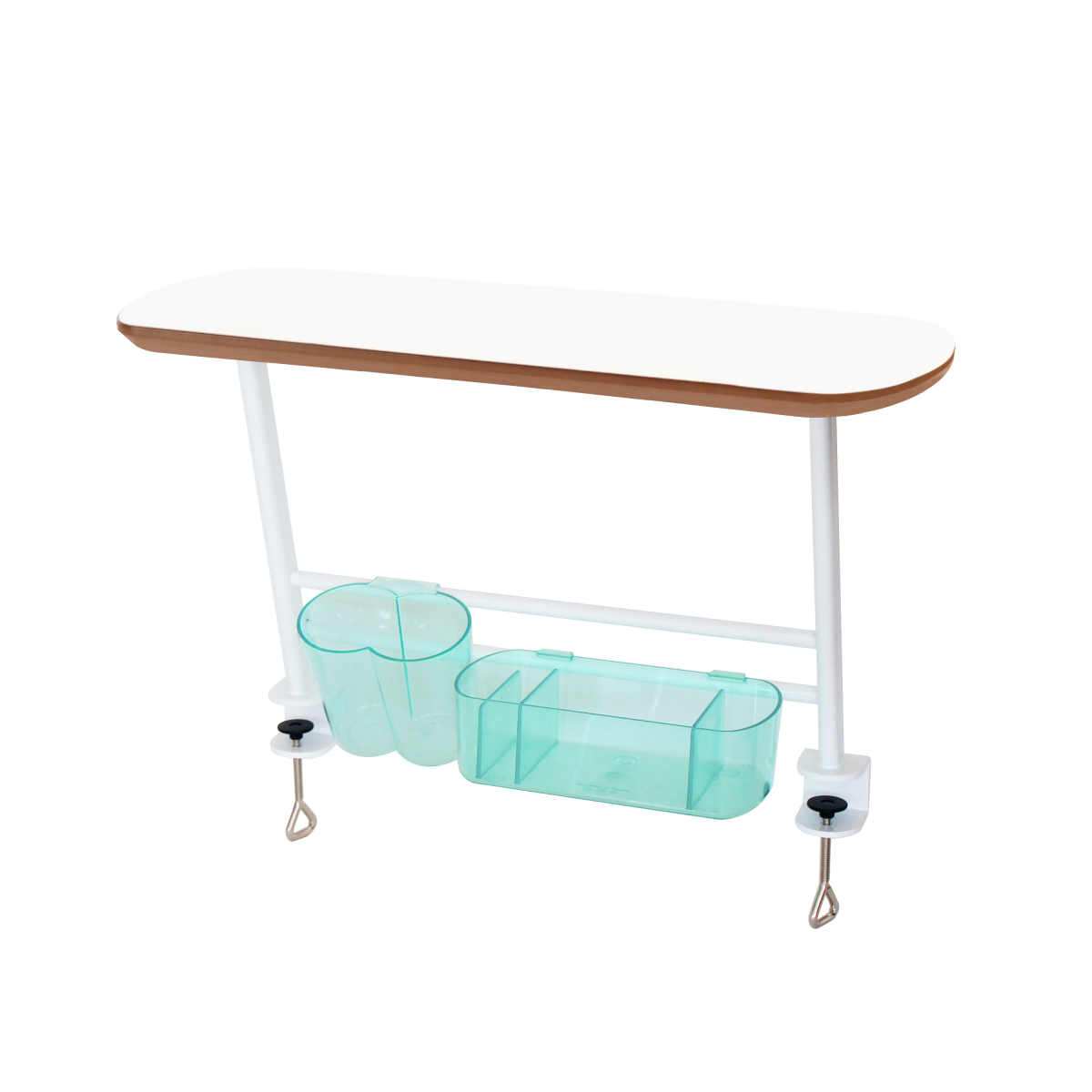 Дополнительно может комплектоваться выдвижным боксом. Выпускается под цвет столешницы парт G2 и М2 - белый. Аксессуары в комплекте в трех цветах: аквамарин, коралл и тёмно-синий.